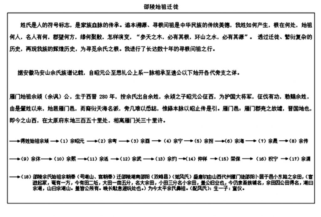 (原文)窃惟结缘青萍,入卞门而价增十倍,巴人下里藉春曲而调承,千秋念世,积卷成轴,荣曾托乎班管?幸此日纂牒,尾宠尤异乎?欧苏不借大笔于巨公,昌慰微恍下士。矧兹国运累治之际,正尔家谱要修之年。片字著源流,纵横识文残,犹存什一于千百,未敢传疑,以示创举。隻词谨淆混,虽腐毫濡笔,惟辨亥豕与鲁鱼,或可纪实,以绍旧闻,爰陈断章,敬述本末。惟大人先生赐省览焉!谨按旧谱,佘姓系出人皇氏支裔,上世古朴,不嫌儗于大宗,概籍天潢,后为黄帝作合宫,接万灵,使主祀天地神示,以职为氏,而命曰示。暨夏后氏时失官,竄于西乔,欲君亲两无所背,乃合人与示而为佘,此佘氏得氏命姓之始,载在旧谱者也。第旧谱作于三世祖评事,已多历年,所二十六世祖廷魁公续修家谱,不能合前后之牒,则始自迁邵一世朝奉公,及今旧谱残失,而由西乔徙代州雁门者,其世次有莫得而悉者矣。今就续谱所载,一世祖朝奉,于唐武德初,宦归过邵,至邵小东路,今名佘田者,胥宇居焉,至今有湖曰“佘湖山”,盖皆因公得名也。二世祖义,仕为宣议。三世祖,仕为评事。七世祖静,仕为都巡检。十世元珠公,授征西元帅。二十世祖玉,仕为元赞善,玉生三子:长曰义宗,官明游系,次曰义泰,三曰义臣,遂派分族三房。绵历迄今,代远丁繁,兼以基址星布,本支蔓延,用景仰前型,漫续谱牒,卷分十二,文四十万言,有奇世录,有述训规,有严礼要,有纪世系,有总图、分图之列家传,有外传、内传之分,艺文敲就,言言金玉,睹陈王之佳制,传来字字珠玑,庶几刻羽,引商汤文贵而家乘丕焕,童叟戴明德之惠行,见光前裕后,青简垂而什。