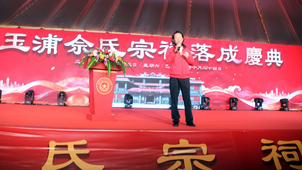 今晚今天是玉浦佘氏宗祠落成的大喜日子。亲人欢聚, 喜气洋洋!借此机会我代表玉浦佘氏宗族向远道而来的各位宗亲、各位亲朋好友表示最热烈的欢迎和最衷心的感谢。你们的到来,彰显大家对我们的关心和支持,更为我们增添了无数的光彩。